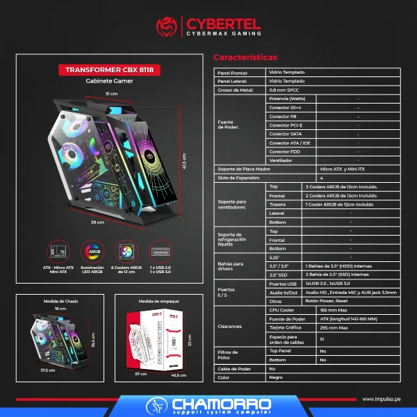 CASE GAMER CYBERTEL CADET TRANSFORMER CBX 8118 BLACK, SIN FUENTE