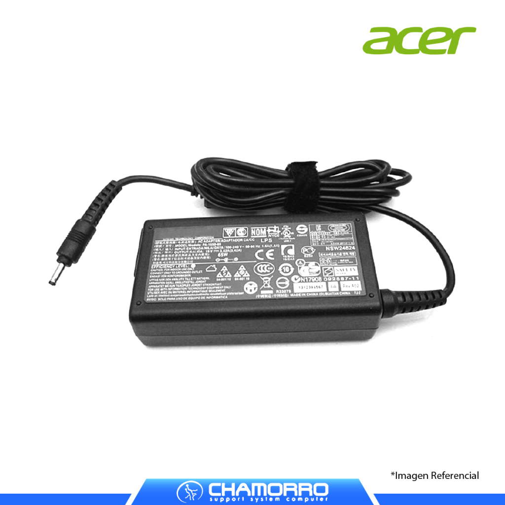 Cargador para laptop Acer con punta fina. Alta compatibilidad, potencia de 65W y entrada universal para un rendimiento eficiente y seguro.