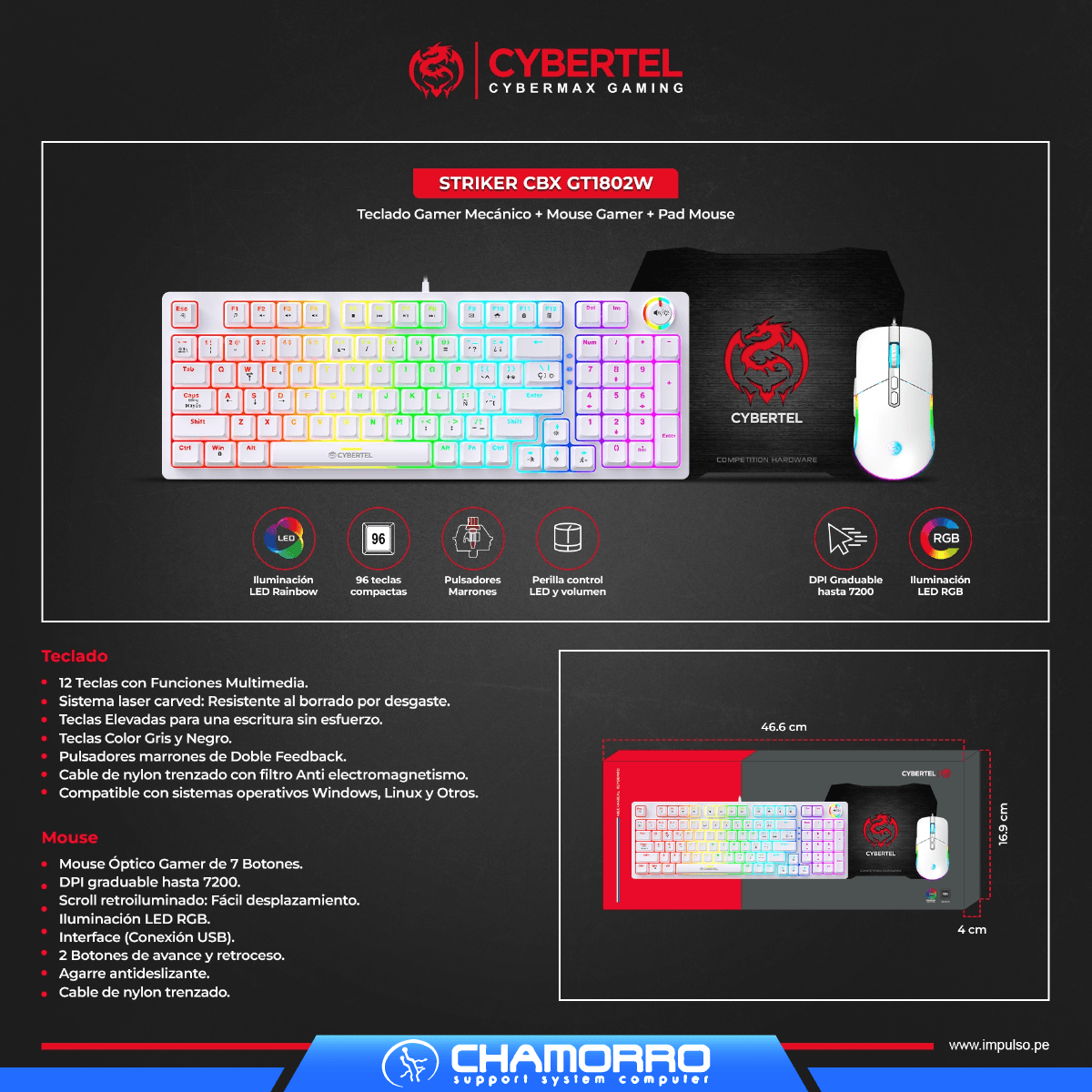 El Cybertel Striker White CBX GT1802W es un kit gaming completo 3 en 1 que incluye teclado mecánico, mouse gamer y pad mouse, diseñado para ofrecer una experiencia gaming superior y profesional. Este conjunto proporciona todas las herramientas esenciales para gaming competitivo y uso profesional en una solución integrada y estilizada.