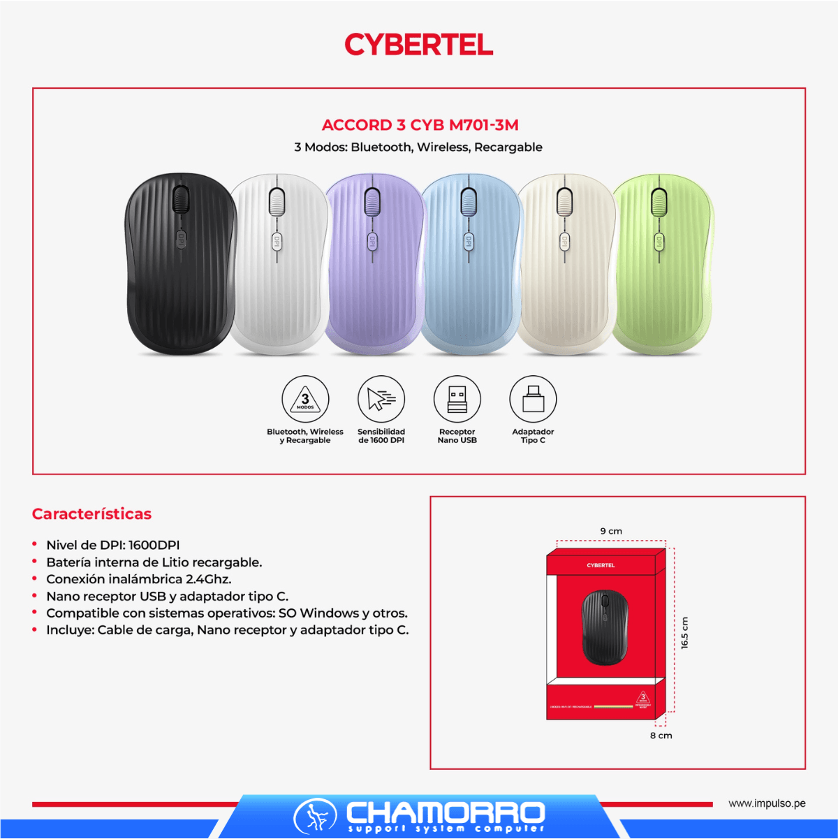 El Mouse Cybertel Accord CYB M701-3M en color púrpura es un dispositivo versátil con 3 modos de conexión (Bluetooth, inalámbrico 2.4GHz y recargable vía USB), diseñado para usuarios que buscan flexibilidad en productividad y uso silencioso. Con un nivel fijo de 1600 DPI para precisión adecuada, incluye una batería interna de litio recargable que proporciona hasta 30 días de uso continuo, eliminando pilas desechables, y clics silenciosos para entornos de trabajo tranquilos. Su nano receptor USB y adaptador Type-C aseguran una conexión estable y de bajo latencia, perfecto para oficinas, viajes o setups multi-dispositivo.