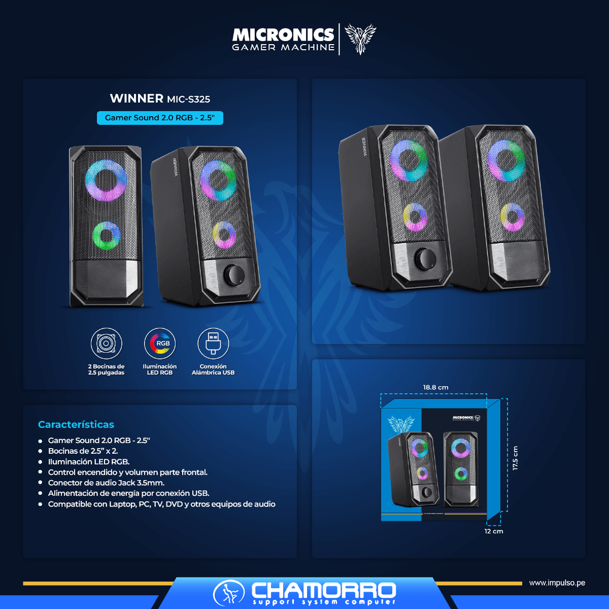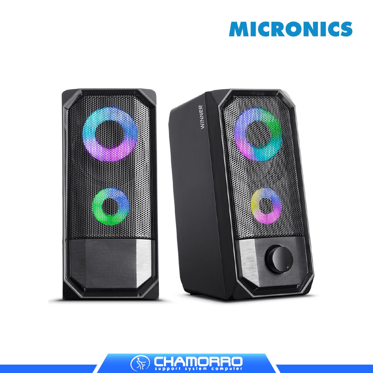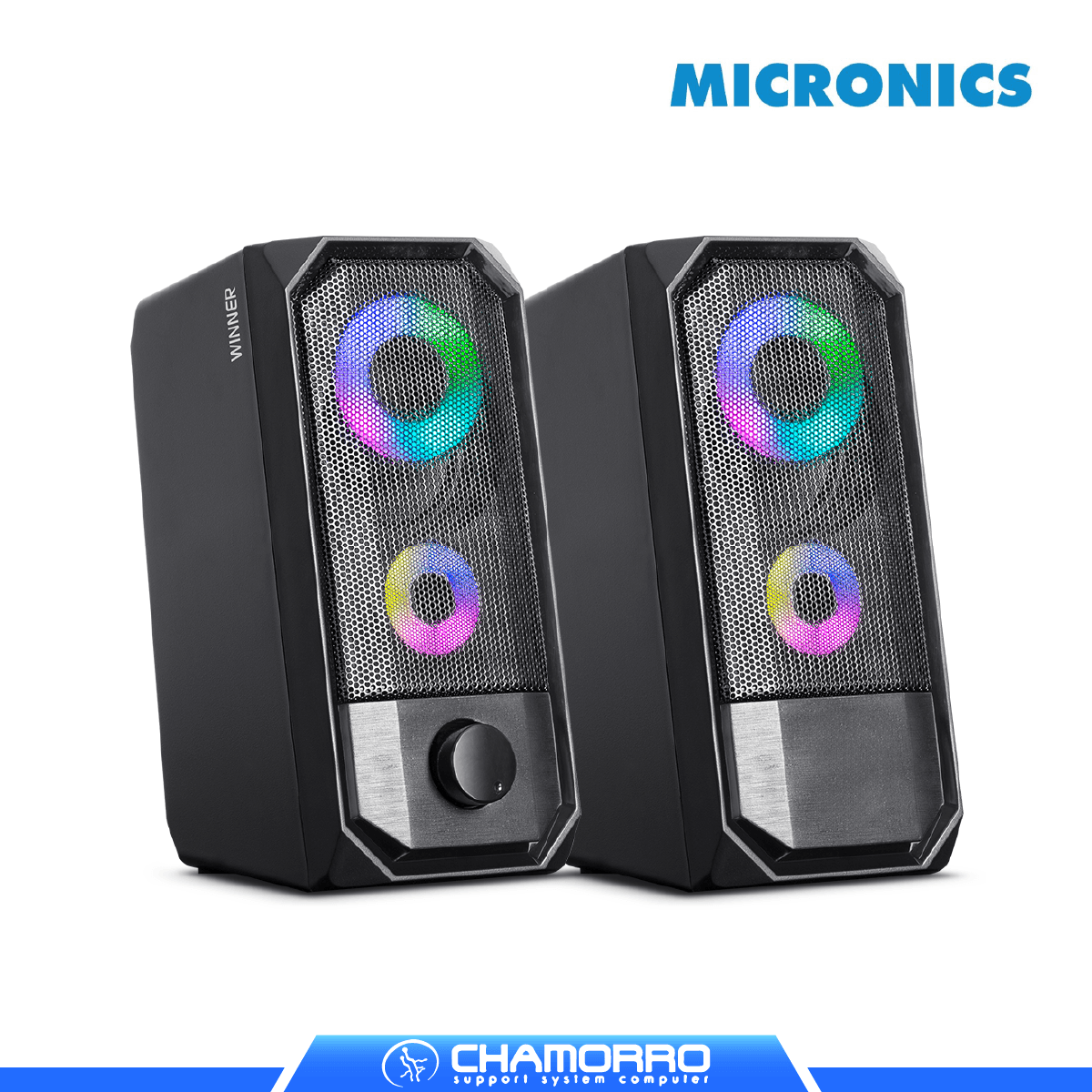 El Parlante Micronics Winner MIC S325 es un sistema 2.0 RGB con bocinas de 2.5″, iluminación LED con switch independiente, controles frontales, conexión Jack 3.5mm + USB, cable de 1.2m y compatibilidad universal para gaming y multimedia.