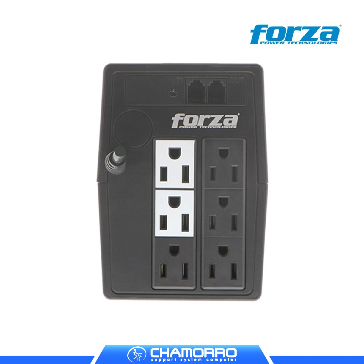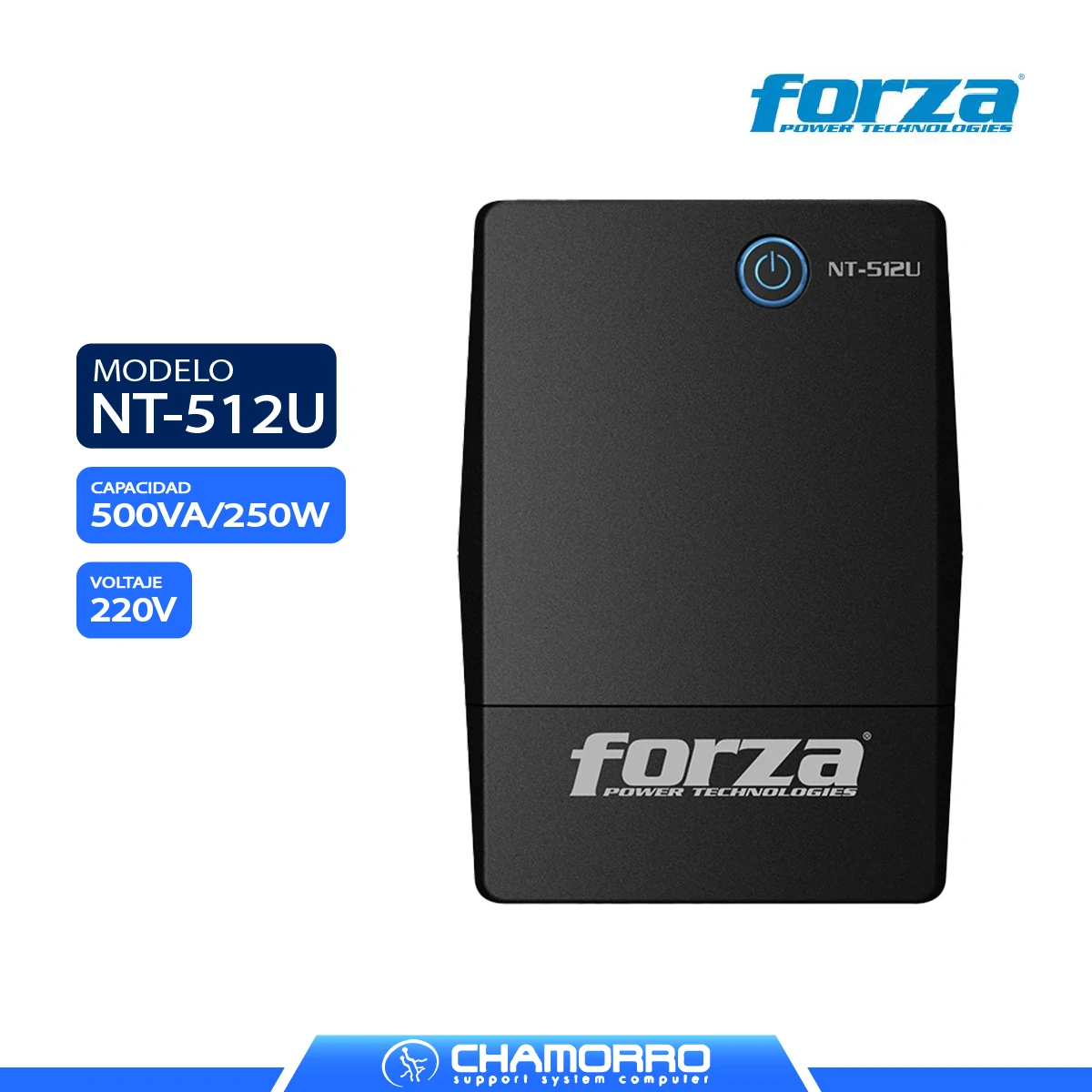 UPS Forza NT-512U: Protección eléctrica básica de 500VA/250W con tecnología Line Interactive, 6 tomas y protección de comunicaciones. Ideal para PC básicos con 18-25 minutos de autonomía en formato compacto.